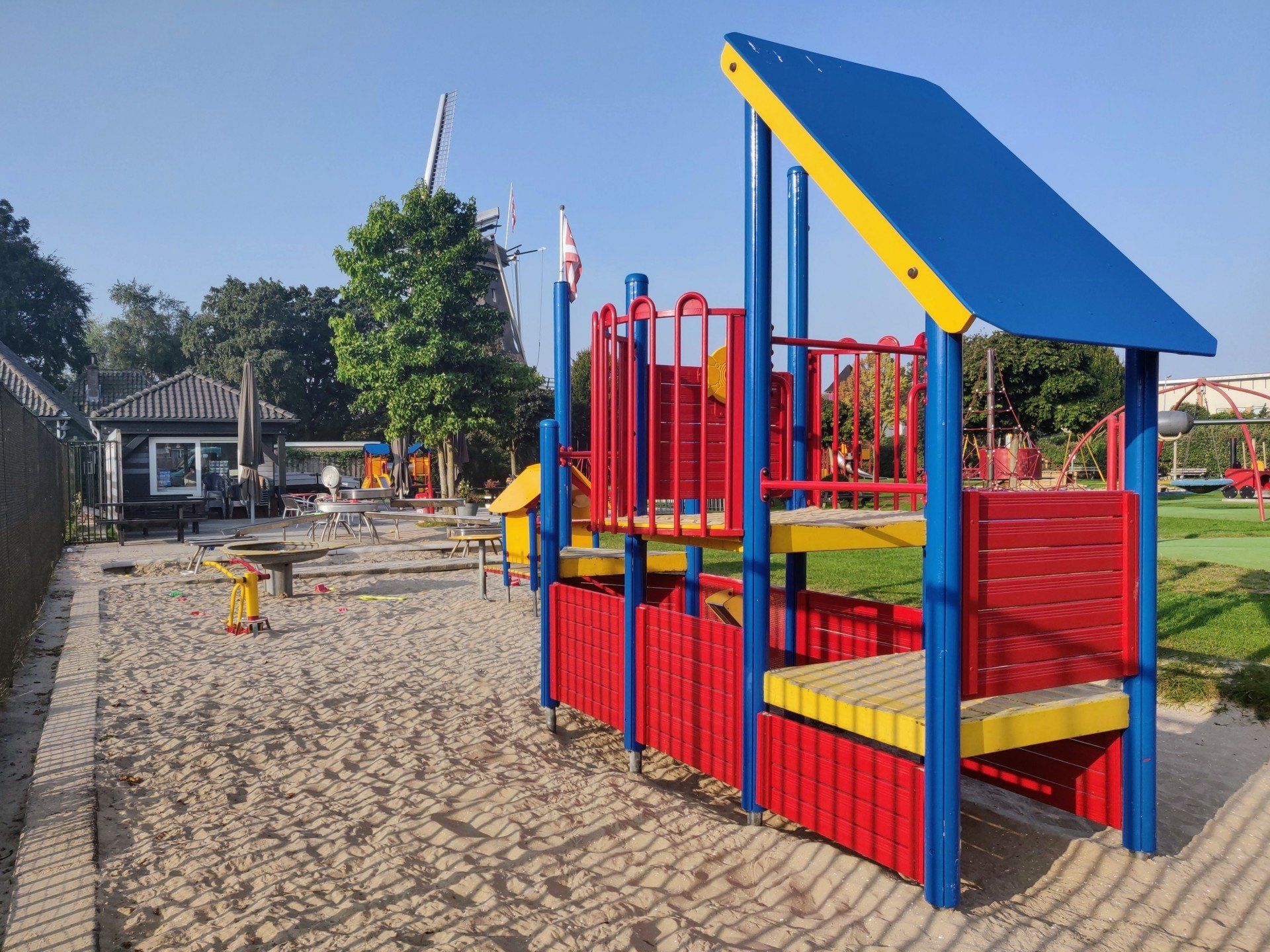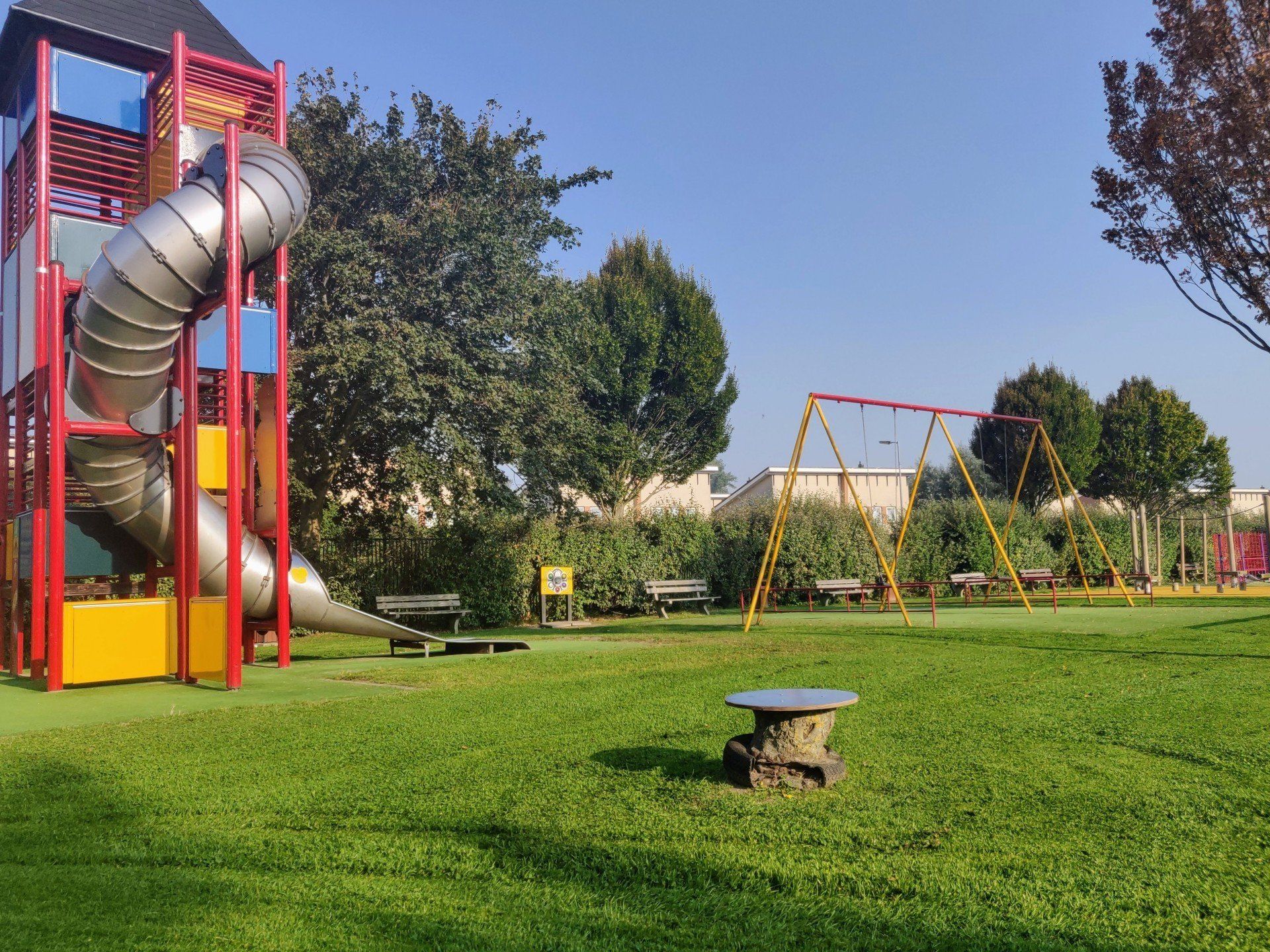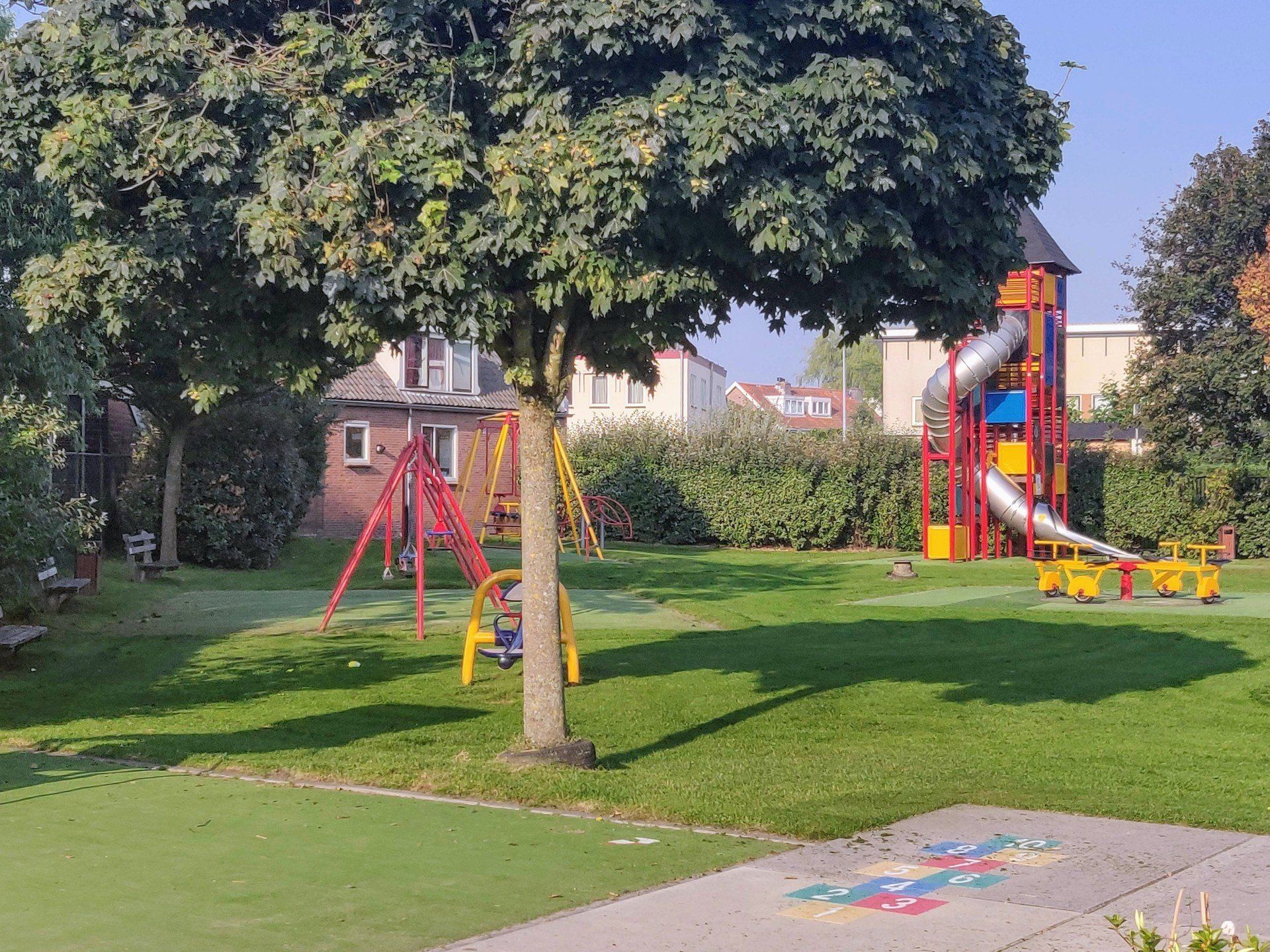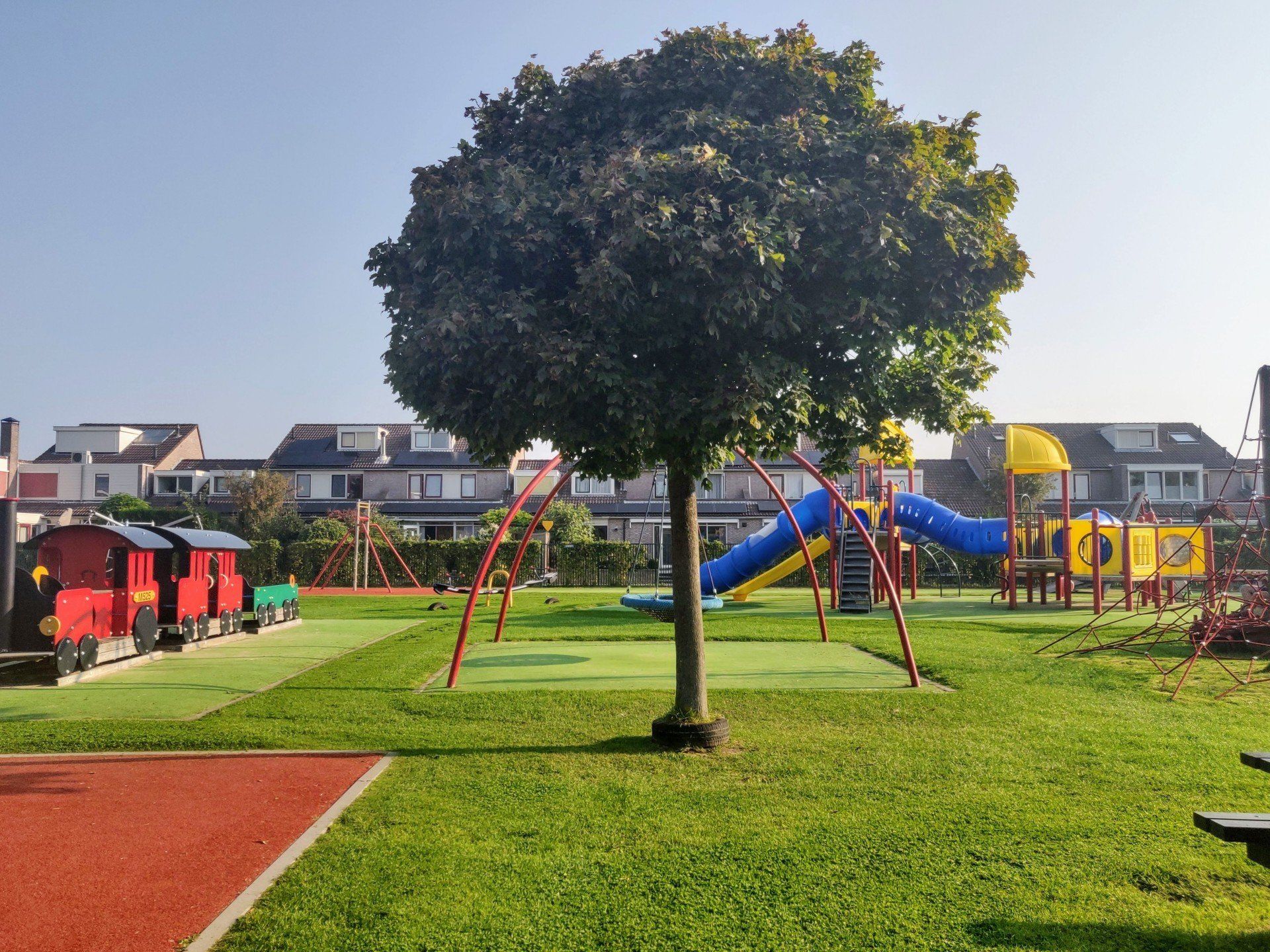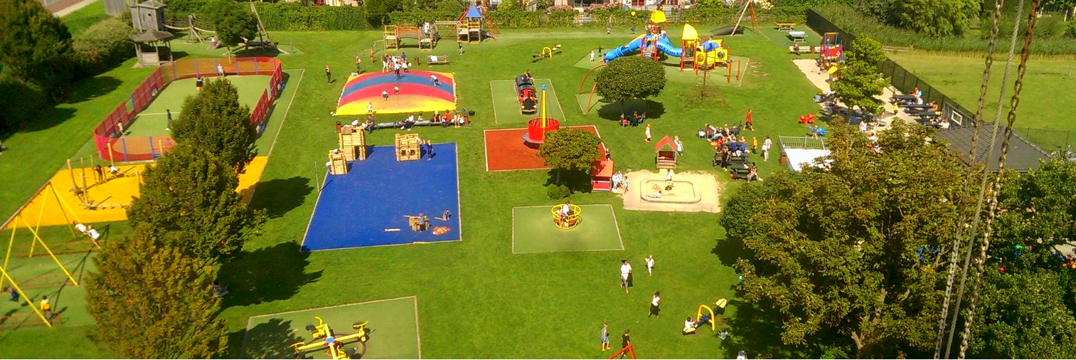 Een mooi overzicht van de mooi aangelegde en onderhouden speeltuin en al haar speeltoestellen!