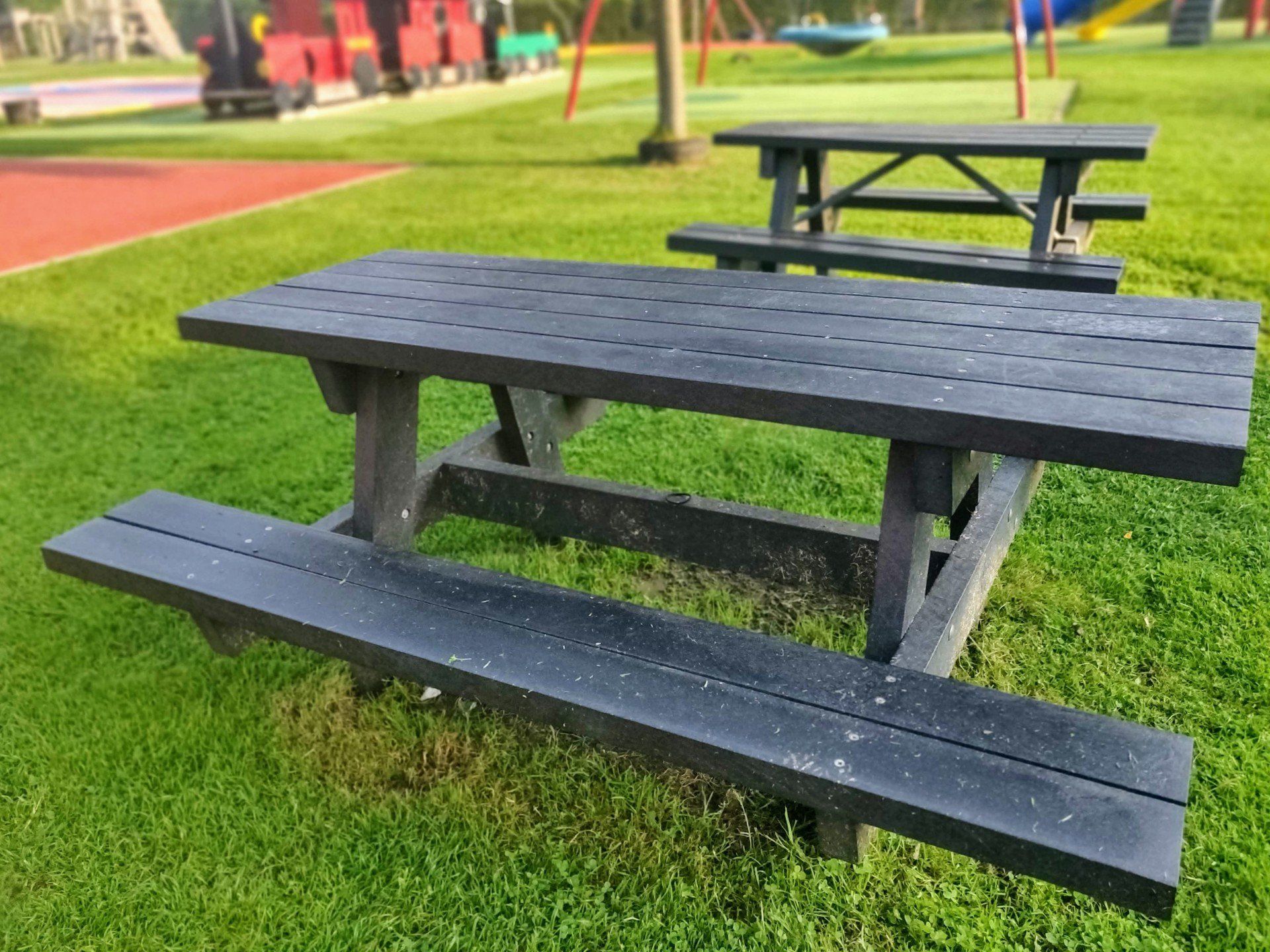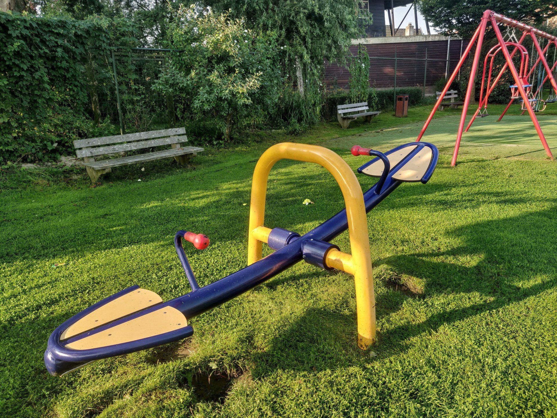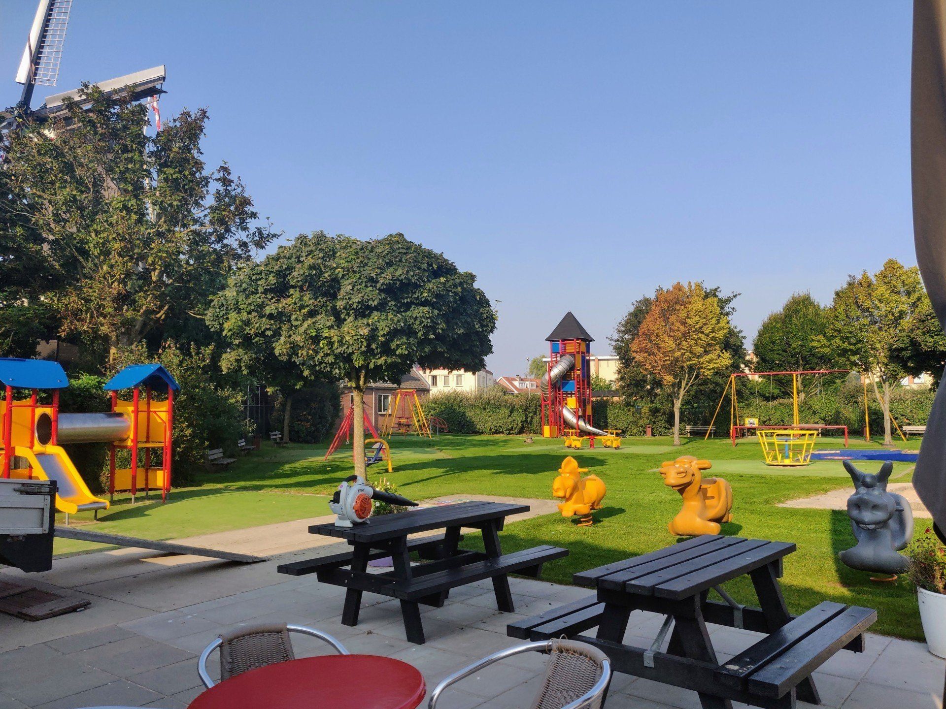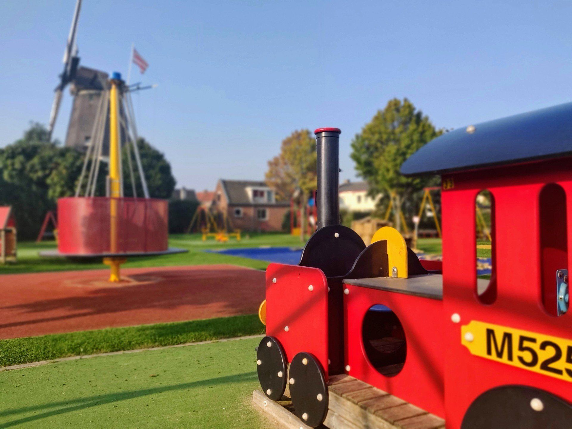 Een mooi overzicht van de mooi aangelegde en onderhouden speeltuin en al haar speeltoestellen!